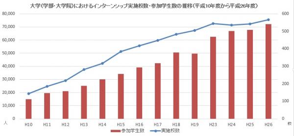 インターンシップを単位認定する大学数(学部・大学院)は、平成26年度では全大学の72.9%で、平成9年度と比較すると5倍強まで増加しています(平成26年度文部科学省「大学等におけるインターンシップの実施状況調査より」)。また大学等が単位認定している以外にも、企業が独自に募集し、学生個人で応募・参加しているインターンシップも相当数存在し、今やインターンシップは一般に広く普及しています。