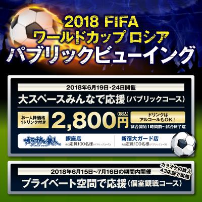 新宿大ガード店と銀座店で開催する「2018FIFA ワールドカップ ロシア パブリックビューイング」では、大型パーティールームにおいて100名様で観戦ができるほか、43店舗においては、個室で飲み放題を楽しみながら観戦できるコースを用意しております。