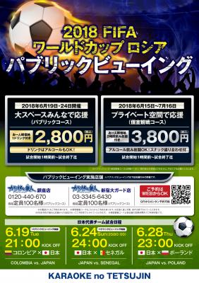 カラオケの鉄人 新宿大ガード店・銀座店の2店舗では、100名様を収容できる大型パーティールームで「2018FIFAワールドカップ ロシア パブリックビューイング」を開催します。試合開始の1時間前から開場し、ご利用料金にはドリンク1杯が含まれます。