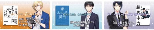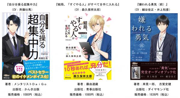 第二弾として、6月29日に『「原因」と「結果」の法則』(CV野島健児)、『超一流の雑談力』(CV前野智昭)、『嫌われる勇気(後)』(CV青年:細谷佳正、哲人:井上和彦)を配信いたします。その後7月にもリリースを予定しており、3か月連続でベストセラーのビジネス書、自己啓発書と豪華声優陣のコラボ作品を配信してまいります。