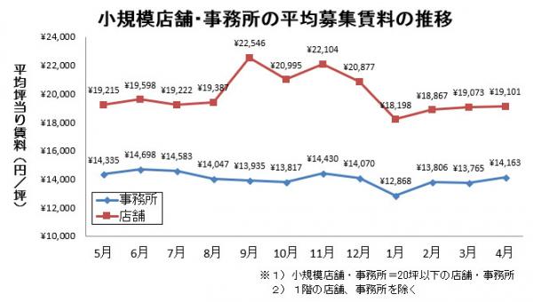 池袋の小規模事務所(20坪以下)の4月度平均募集賃料は、前月から2.9%上昇しました。