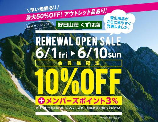 6月1日(金)から10日(日)まで開催するリニューアルオープンセールでは、好日山荘メンバーズ限定でお買上げ商品をレジにて10%OFF致します(一部対象外商品あり)。さらに、期間中お買上げ頂いたお客様に、好日山荘特製ノベルティグッズをプレゼントいたします(お買上げ条件あり。先着100名様)。