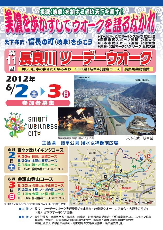 岐阜市で、平成30年6月2日(土)と3日(日)に「第17回 長良川ツーデーウオーク」が開催されます。主催は、長良川ツーデーウオーク実行委員会(岐阜市・岐阜県ウオーキング協会・公益財団法人岐阜観光コンベンション協会・大垣歩こう会・一般社団法人日本ウオーキング協会)です。