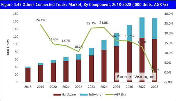 コネクテッドトラック市場展望レポート 2018-2028年:コンポーネント別(ハードウェア、ソフトウェア)、地域別と国別の予測、IoTエコシステム内のテレマティクスと接続技術の主要開発企業分析