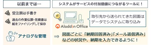 手書きの受注票や、ファイリングして保存している作業伝票や見積書などアナログな管理が多かった。取引先から「いつもの」と言われる注文や、数年前の注文に関する問い合わせへの回答に苦労していた。