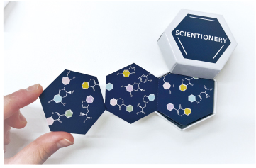 「SCIENTIONERY」は、理科や化学のテキストで見たことのある数字や記号をモチーフにしたステーショナリーです。Ag(銀)、Rn(ラドン)、Al(アルミニウム)といった原子記号や、化学式を模様にしたステーショナリーは、リケジョならずとも持っているだけで賢く見える気分になります。特に特長的なのは、メッセージカードです。六角形の花のようにも見えるカードにメッセージを書き込み、端を重ねていくと、ベンゼン環の形になります。書いた内容も見えないので、オフィスで重宝します。