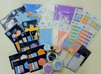 また、六角形の箱に入ったループメモは、切り取って使え、デスクに置くと知的な印象です。ベンゼン環ふせん、ToDoリストふせん、マスキングテープ、メモ帳、シール、マグネットブックマーカー、フラットケース、箱入りループメモ、便せんセット、メッセージカードなど、オフィスや自宅で便利に使える12種類のアイテムを展開しています。スモ―キーがかったパステルカラーの色合いと理系モチーフのかしこカワイイ文具「SCIENTIONERY」は、ギフトとしても最適です。