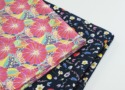 シャツやワンピース作りに適している40Sコーマブロードは、これまで顔料インクジェットによる加工のみでしたが、ほぼ同じ品質の布で染料インクジェットによる加工の「40Sブロード(染料)」を発売開始いたしました。こちらは黒や紺色などの濃色が綺麗に表現され、染色堅牢度が高く、布の風合いが滑らかな仕上がりです。アパレル業者様も安心してご購入頂けます。1m3,300円(税抜)、納期は15営業日です。