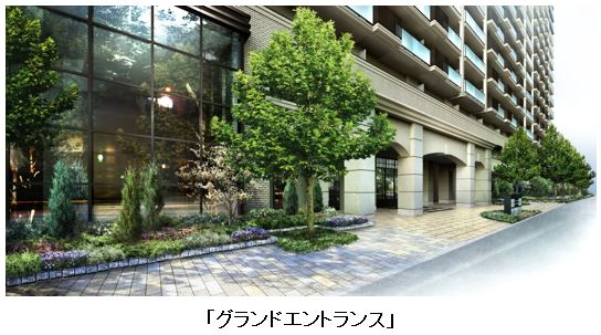 「グランドエントランス」は、ポラスグループが手掛ける近隣の一戸建て分譲住宅と連動させ、フランスの街並をイメージしています。デザインはパリのラグジュアリーホテルを意識し、マロニエの並木を配置しました。基壇部は質感豊かなタイルを取り入れ、並木と一体となるデザインを実現。「グランドエントランス」横には、パリの街並を想像させる格子窓をデザインした「光と緑のアトリウム」を設え、ホテルライクな解放感あふれるラウンジが迎える演出にしました。