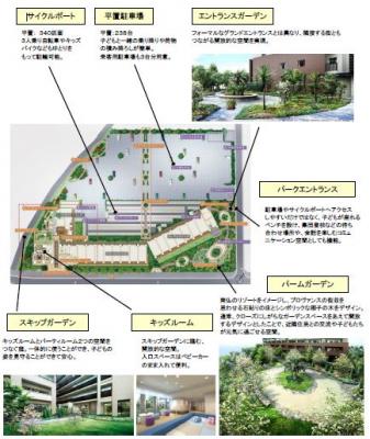 としても機能する「パークエントランス」、子どもがのびのびと遊べ、親も安心して見守りができる「スキップガーデン」及び「キッズルーム」など、子育て世帯に必要な空間を作りました。