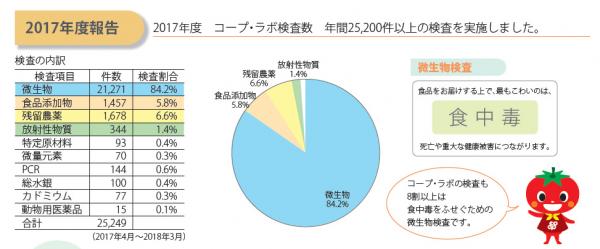 2017年度のコープ・ラボの検査数は、25,249件でした。食中毒をふせぐための微生物検査が8割以上を占めました。