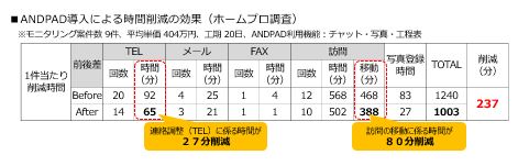 「ANDPAD」を導入することで、1案件当たり施工管理業務に係る時間が平均で237分削減したという結果が確認できました。(ホームプロ調査)