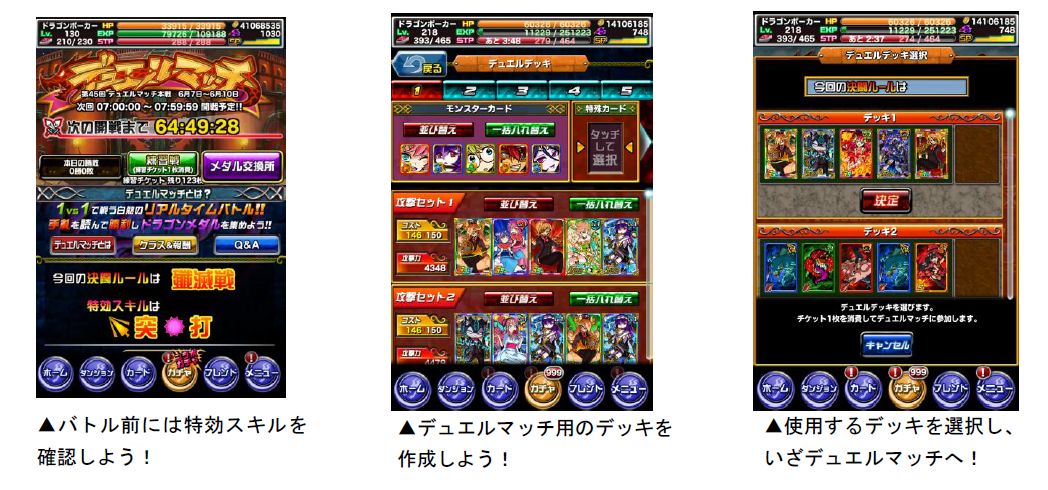 デュエルマッチでは、通常よりも高い効果を発揮する「特効スキル」が設定されています。今回の「デュエルマッチ」の特効スキルは、突・打です。特効スキルのカードをデッキに入れて、有利にバトルを勝ち進めましょう。