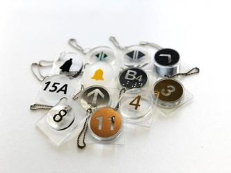 当商品は、『エレベーターボタンコレクション』と名づけて、形状や柄、色など100種類以上のバリエーションで展開しています。日頃からエレベーターボタンで馴染みのある “階数表示”や“開閉”のマークをはじめ、普段なかなか押すことができない“非常ボタン”、中国の高層ビルの“108階”のボタンなどを用意し、大人のコレクター魂をくすぐるコレクションです。また、キーホルダーといえども、本物のエレベーターボタンと同じ作業工程を踏み、職人の手で一つひとつ丁寧に作られています。