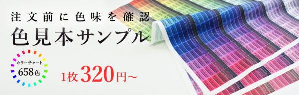 同じ色のデータでも布の種類や加工方法により、色味が異なります。「色見本サンプル」は658色のカラーチップと色の数値を記載してあり、布・生地の色味を注文前にご確認いただけます。印刷後の色味が不安な方は、まずは「色見サンプル」でご確認する事をお薦めいたします。