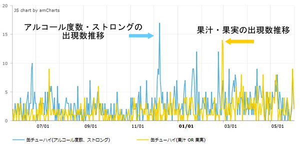 ・去年の5月期から今年の2月期までは「ストロング」「アルコール度数」の出現数が圧倒的に多かったが、3月期から「果汁」「果実」の出現数が増え、拮抗してきていることが分かります。