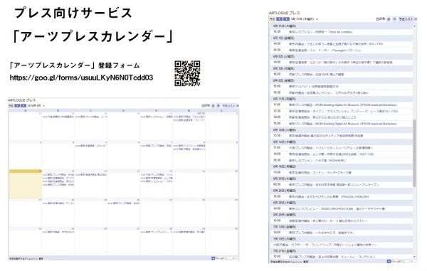 (3) アーツプレスカレンダー:プレス向けサービスとして、全国の美術館・ギャラリーなどで行われる、プレス内覧会やレセプションなどをGoogleカレンダーにまとめて掲載。ご登録いただいたプレスの方に、いつ、どこで、何が行われるか必要な情報をお届けします。