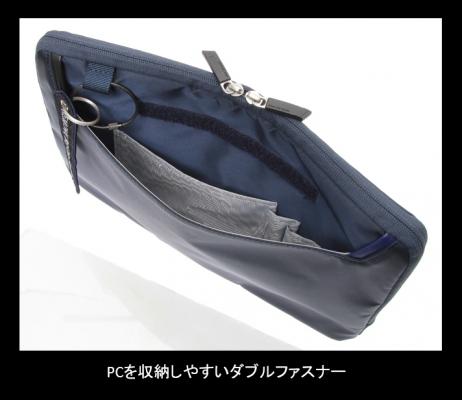 新商品のPCケースは、13インチのノートPCが収納可能なインナーケースとして単体でも使用ができ、持ち運びに便利です。パソコン収納部には外部からの衝撃を和らげるクッション素材を採用し、傷が付きにくい起毛生地を施しました。前面には書類やペンなどを収納可能なポケットが付いています。