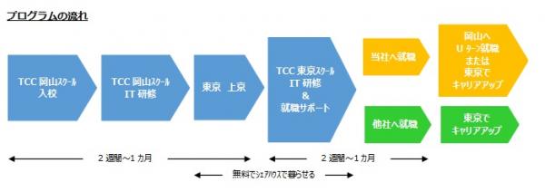 地方から東京へ就職するためのIT知識教育、就職支援サポートプログラム。第1弾は、岡山を起点にして2018年6月よりサービスを開始。専門資格取得率100%のITスクール受講、東京での住まい、住まいでのインターネット接続、光熱費、水、お米がすべて無料。東京で自分で職探しする必要はなく、安心して働ける企業を紹介します。さらに、希望者は、Uターン就職も可能です。