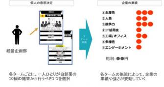今、最も関心を集めている「働き方改革」をテーマにしたビジネスゲームを開発しました。ゲームでは、チーム内メンバーが、経営企画、人事労務、採用担当のほか、総務、マーケティング、システム等の部署にわかれ、投資やイノベーションによる生産性向上とともに、個人の意欲や能力を存分に発揮できる環境を整える施策を打っていきます。