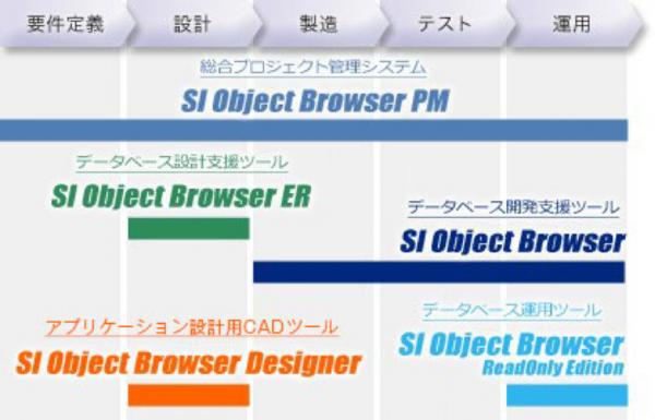 当社は、ソフトウェア開発の近代化を推進し、日本のIT産業の国際競争力強化を目指しております。「SI Object Browser」シリーズは、その目標のための製品群で、ソフトウェア・ライフサイクル・プロセス(SLCP)全体をカバーする総合支援ツールです。現在の「SI Object Browser」シリーズは、次の5製品です。