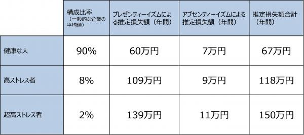 過去2年間合計10社、約5,000人に対して行ったストレスチェックの結果を基に算出したところ、高ストレス者一人当たり、最大150万円、従業員数1,000名あたり最大6,700万円の損失を生んでいる可能性がある事が、当調査結果より示唆されました(発表:2018年6月19日(火))。