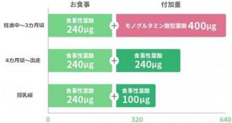 妊娠を計画する1カ月前から妊娠3カ月頃までは吸収性が高いモノグルタミン酸型葉酸(※1)、その後の4カ月頃から出産・授乳時までは食事性葉酸(※2)が推奨されており、モノグルタミン酸型葉酸を摂取する必要はありません。長い時期を対象としたオールインワン型のサプリメントは便利ですが、時期ごとに異なるきめ細かな栄養素摂取には向いていないことがわかります。
