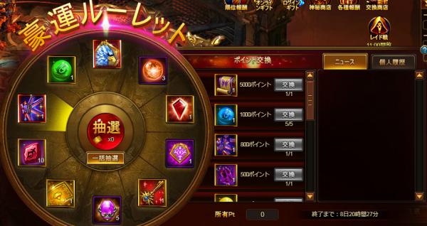 イベント期間中、豪運券を使って豪運ルーレットに参加することが出来ます。豪運ルーレットにはイベント限定騎獣やレア光翼が登場します。また、ルーレットを回すたびにポイントがたまり、集めたポイントを使って、新聖器【邪神の鏡】の破片等、レアアイテムと交換することが出来ます。