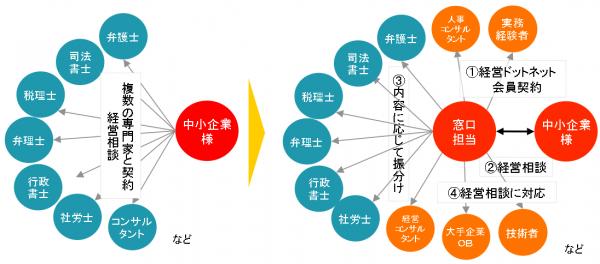 てスタートさせるもので、各士業からコンサルタント及び経験豊富な実務経験者、技術者、業界知見者、幅広く人脈を持つ大手企業出身者等、実務に強い専門家が企業の悩み事を解決します。