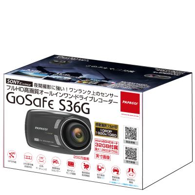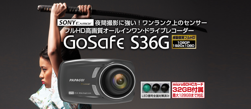 夜間撮影に強い!SONY Exmorイメージセンサーを搭載した「GoSafe S36G」は、最大128GB対応&GPS内蔵のオールインワン型フルHD高画質ドライブレコーダーです。Gシリーズの特長3つのチカラ(撮影力+技術力+耐久力)を継承し、主にGPS内蔵、最大128GBまで対応(標準付属32GB)、WDR、Gセンサー、常時/衝撃時/手動時の記録、全国LED信号機対応など真実を撮影するチカラを備えています。また、各種警告機能や防犯対策機能など運転をサポートするチカラや、太陽を浴び続ける苛酷な環境に耐えるチカラのハイエアフロー設計やハニカム構造、オールガラスレンズの他に年間100万台以上の販売実績と赤道直下の国々から極寒の地まで世界中に支持される品質のドライブレコーダーを提供します。別売リアカメラ「S1」に対応し、2カメラドライブレコーダーに拡張可能です。