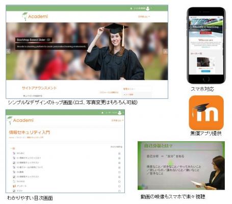 オープンソースの学習管理システム、Moodle【ムードル】にはたくさんの機能がありますが、それらをすべて使いこなすことは熟練者でも困難です。そこで、はじめて学習管理システムを利用する人にもやさしいように、最新バージョンのMoodle3.5に必要最小限度の機能を搭載したシンプルパターンを誕生させました。これまで通り、複雑な「管理ブロック」の簡易化を行っており、またコースごとに学習者の履修状況を一目で確認できる「学習履歴ブロック」の機能も踏襲しております。