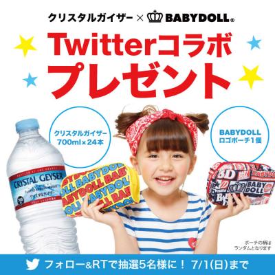 抽選で5名様に「BABYDOLLロゴポーチ1個」と「クリスタルガイザー700ml×24本」プレゼント