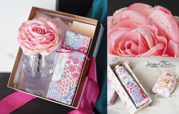 当ギフトは、主役の「ピンクバラ」と、ハンドクリームまたはソープ(固形石鹸)がセットになります。アメリカの人気クリエイター兼デザイナーのマーゴット・エリーナ(※2)が手掛るフレグランスブランド「ライブラリーオブフラワーズ」の雑貨を起用し、お花と香りグッズを組み合わせたギフトボックスに仕立てています。小花柄が描かれた可憐なパッケージと、その香り高きフレグランスアイテムは世界中の女性を魅了しています。お誕生日プレゼントやご結婚記念日、お付き合い記念日のプレゼントに「アクセサリー以外の何か」をお探しの男性や「お花と一緒に何かをプレゼントしたい」という方に向けて、1度で2種類楽しめるお得なギフトとしてご提案致します。