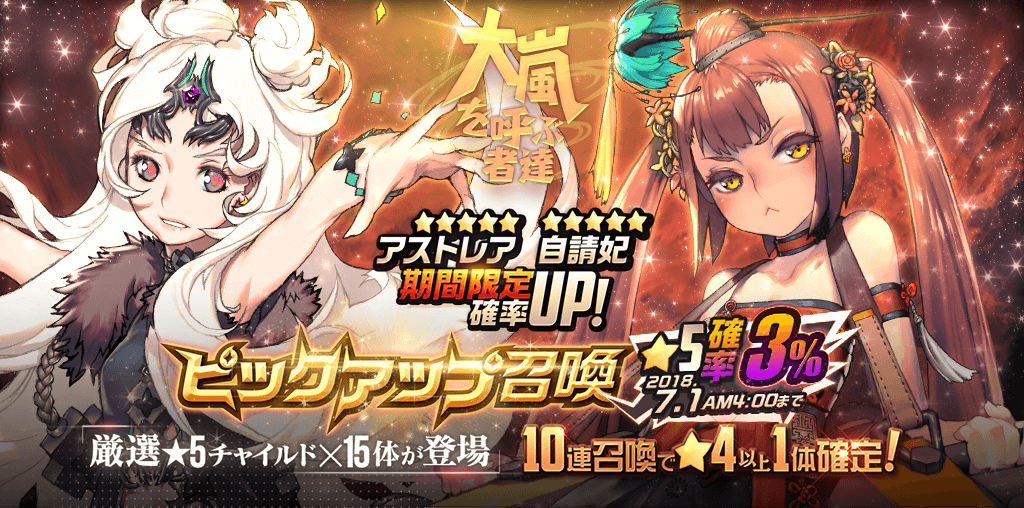 全てを吹き飛ばす大砲使い!!対レイド特化の超強力な新チャイルド、★5「自請妃〈じせいひ〉」(CV: 立花理香)と、全てを貫く呪いの槍!攻撃を受けるたびに自身のHP回復効果を発動するユニークスキル「秘癒」を持つ★5「アストレア」(CV: 池上千尋)がピックアップ召喚15体の中でもさらに召喚確率がUPして登場!!