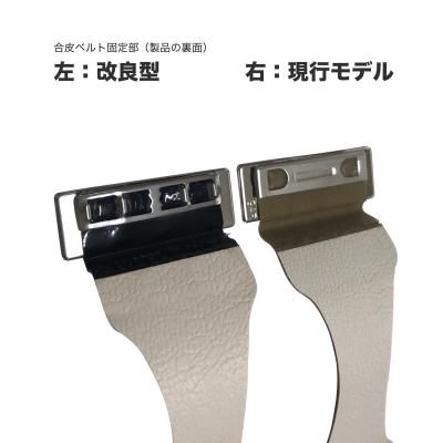 「SMA-BELT」は金属製固定具で合皮ベルトを固定する構造で、小さな金物でベルトを安定させる構造は特許登録済みです。
