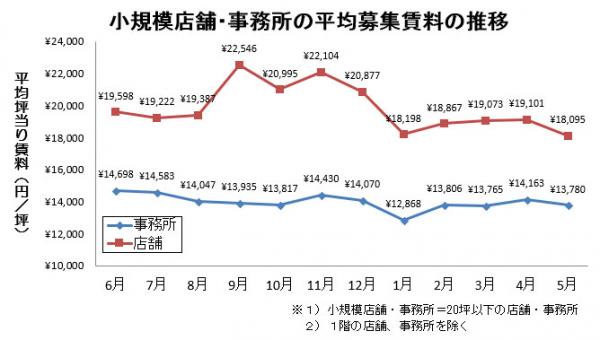 小規模店舗(20坪以下)の平均募集賃料は、前月から5.3%下降しました。