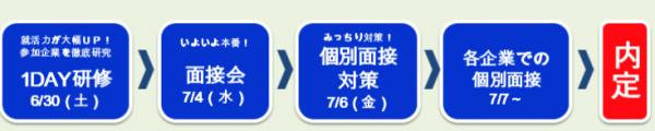 1日の研修の翌週に集団面接会を行い、その後個別面接研修を受けて各企業の面接から内定獲得へ挑みます。内定から入社までのサポート体制も整えておりますので、安心して就職活動に励むことができます。