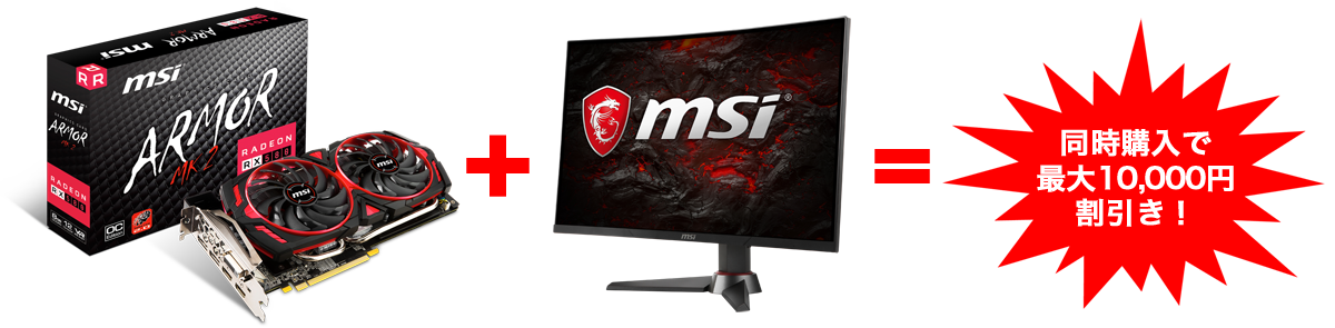本キャンペーンは、対象のMSI製AMD Radeon搭載グラフィックスカードを、FreeSync対応のMSI製湾曲型GAMINGモニター「Optix MAG27C」または「Optix MAG27CQ」と指定取扱店舗で同時購入していただくと、最大10,000円(税込)の割引きを実施するというものです。
