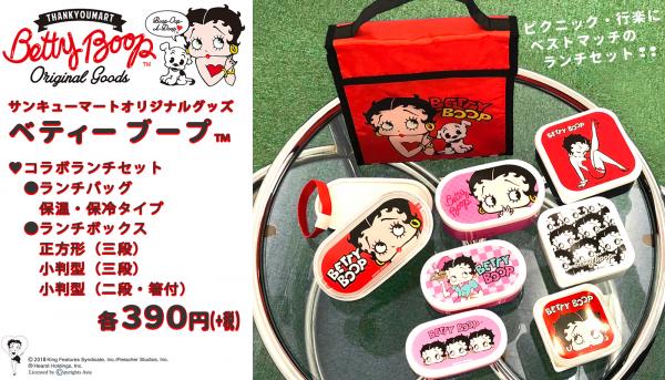 「サンキューマート公式オンラインショップ」にて2018年7月2日より「ベティー ブープ」と「サンキューマート」コラボランチボックス3種、ランチバッグを先行販売。7月3日より、全国サンキューマートにて販売開始致します。