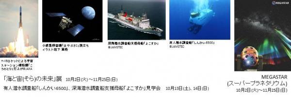 国立研究開発法人宇宙航空研究開発機構(以下、JAXA)と国立研究開発法人海洋研究開発機構(以下、JAMSTEC)の全面的な協力のもと、「未知への挑戦~夢を追う人々~」をテーマとして、実際のロケットエンジンをはじめ、ロケットや調査船の大型模型や小惑星や深海の映像により、「生活圏の拡大、深海へ宇宙へ」、そして、「生命の起源、深海か宇宙か」という研究成果を紹介。最先端の科学技術への関心や未知への探究に思いを馳せる契機となることを願い、開催いたします。