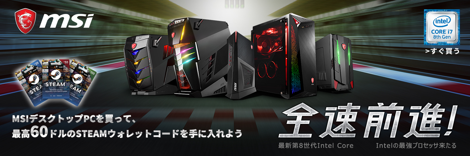 2018年7月4日 - Micro-Star International Co., Ltd. 台湾・新北市 - GAMING向けハードウェアの設計で世界をリードするMicro-Star International(MSI)は、7月5日から8月15日までの期間中に、第8世代Intel Coreプロセッサを搭載したMSI GAMINGデスクトップを購入された方を対象に、最高60米ドルのSteamウォレットコードをプレゼントする「全速前進!」キャンペーンを実施いたします。なお、本キャンペーンは、予定数量に達した場合、キャンペーン期間中でも終了することがあります。