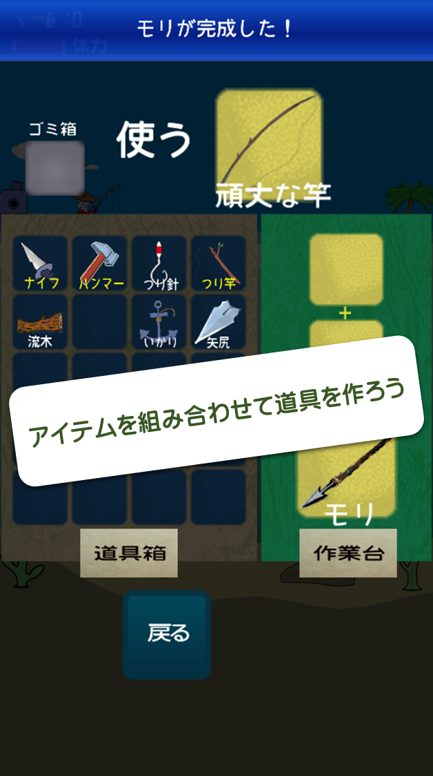 ・アイテムを組み合わせて釣り道具を作成することで、より大きな魚を釣ることが出来ます。