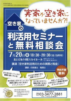 そこで、早速、東京都行政書士会は7月20日(金)午後6時半から東京都北区北とぴあで「空き家利活用のための実際と税金」と題し、行政書士及び税理士が講師となりセミナーを開催します。相続した実家や施設に入った親の家など、空き家を利活用したいが、何から手をつけたらよいかわからない、と日頃悩みを抱えている方々を対象に、実際に即した解説を行います。終了後はご希望により個別に相談も応じます。