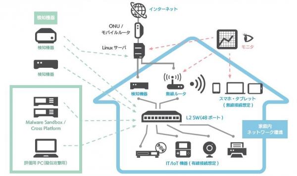 この研究では、一般家庭を想定したコネクテッドホーム試験室を作り、国内で一般に販売され、インターネット接続機能があるさまざまな家電やネットワーク機器、IoT機器などを約20カテゴリーからピックアップし、設置しています。また、それらに対するサイバー攻撃や、マルウエア感染などの活動の観測を行い、一般家庭のネットワーク環境やIoT機器、パソコンなどにどのような影響を与えるか、将来におけるリスクと対応策、防御方法について研究を行います。