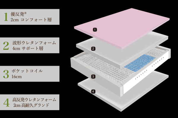 優反発は「低反発のフィット感」と「高反発のサポート力」を併せ持つ、今注目されている新素材です。身体を優しく包み込む柔らかさがありながらも、しっかりとした反発力を持っています。また乗せた重さによって支える力の大きさが変化するため、どんな方でも理想的な寝姿勢を実現し、質の良い眠りが実感できます。
