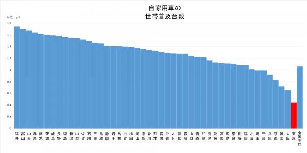 近年、日本全国における自家用車の世帯当たり普及台数は2006年の1.11台をピークに減少傾向が続き、2017年には1.06台と18年前の水準まで低下致しました。特に東京都では、0.45台を記録するなど、都心部を中心にクルマを持たない世帯が増加傾向にあります。