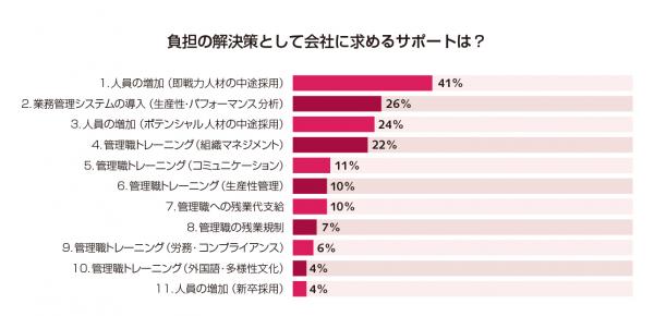 会社に求める解決策は1位「即戦力人材の増員」、「管理職の残業規制」は低支持