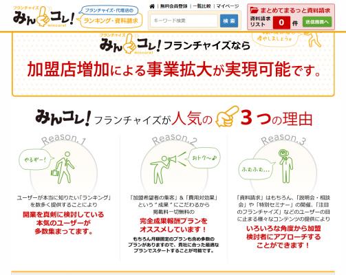 【みんコレ!フランチャイズ】は、加盟者を募集中のフランチャイズ本部や代理店本部の情報を掲載し、独立・開業希望者が各本部の比較や資料請求、説明会の申込みができるなど、独立・開業希望者と本部を結び付けることよって「成功者を量産する」ことを最大の目的としているWEBサイトです。