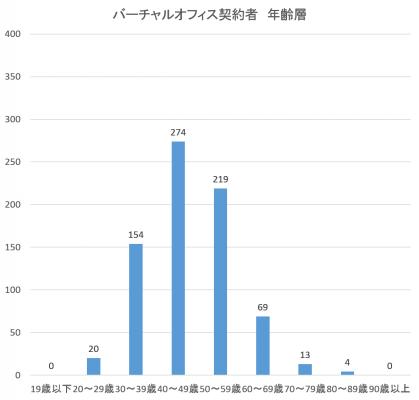 【年齢層・バーチャルオフィス】19歳以下:0名、20~29歳:20名、30~39歳:154名、40~49歳:274名、50~59歳:219名、60~69歳:69名、70~79歳:13名、80~89歳:4名、90歳以上:0名