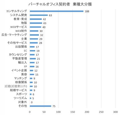 【業種・バーチャルオフィス】コンサルティング:188名、システム開発:63名、教育・育成:42名、物販:43名、WEBサービス:40名、WEB制作:30名、広告・マーケティング:32名、士業:29名、その他サービス:28名、出版関係:17名、不動産管理:21名、カウンセリング:17名、EC:19名、輸出入:17名、FP:16名、美容:15名、イベント企画:12名、マッチング:9名、映像関係:10名、派遣(派遣業以外):10名、結婚サービス:9名、スポーツ:6名、ツーリズム:5名、対象外:0名、その他:75名